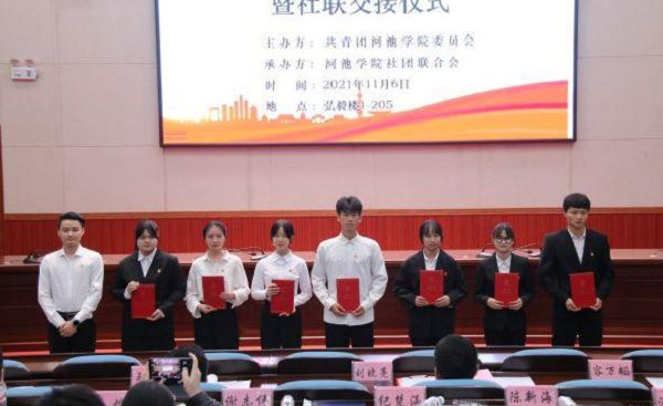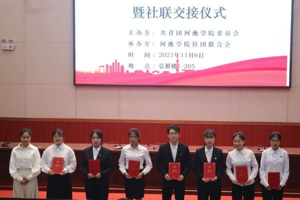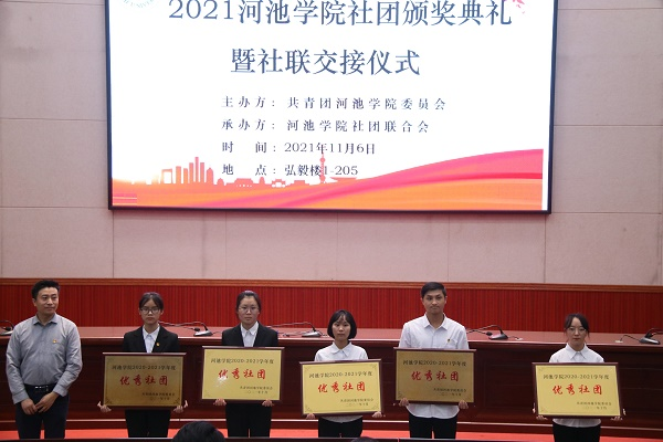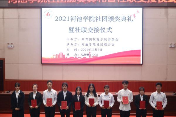 2021年11月6日19时,由共青团必赢3003no1线路检测中心委员会主办、必赢3003no1线路检测中心社团联合会承办的以“演绎社团魅力,谱写社联华章”为主题的社团颁奖典礼暨社联交接仪式在弘毅楼一区205报告厅圆满落幕。参加本次活动的嘉宾有校团委副书记刘晓亮老师、化学与生物工程学院团委书记王勇亮老师、大数据与计算机学院团委书记容万韬老师、校团委孙艳平老师。校团委、学生会、志联、各二级学院和各社团代表应邀参加了此次活动,本次活动由社团联合会文体部的潘陈涛、马海萍主持。