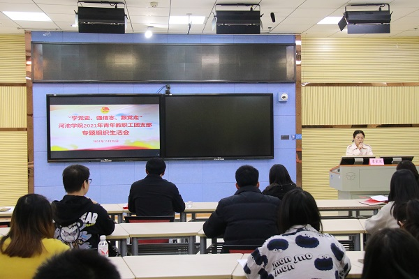 支部书记胡海东汇报今年本支部的党史学习情况,并对支部进行党史深入学习表示肯定,本支部在学校党委的统一领导和团委的具体指导下,注重加强对于青年团员教师党性的锤炼,引导广大青年团员教师深入学习贯彻党的十九届六中全会会议精神,不断坚定理想信念,厚植爱国情怀,坚守政治本色。并表示如今线上开展学习百年党史已在必赢3003no1线路检测中心青年教师和学生群体中覆盖率达100%。