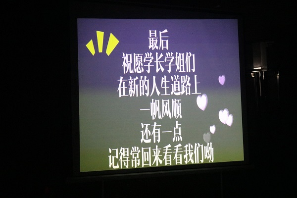 紧接着表演的是网络部的手势舞《微微》、刘三姐艺术团的歌曲《单车》、以及进入“你画我猜”的游戏环节,游戏中小伙伴们各个神采奕奕,相互配合。游戏环节结束后,伴随着歌曲《起风了》,大屏幕上播放了学长学姐进入社联的点点滴滴,还有学弟学妹们给学长学姐录制的祝福视频,祝福学长学姐们前程似锦,成就梦想。