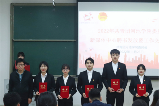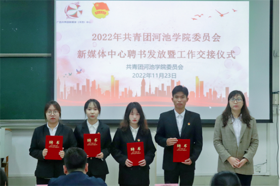 为推动广西共青团新媒体(河池)中心工作长久发展,提高内部成员的综合素质,加强广西共青团新媒体(河池)中心自身组织建设。11月23日,新媒体中心在弘毅楼2-105教室召开聘书发放暨工作交接仪式。校团委副书记王爱林、校团委老师徐辛酉和胡海东受邀参与会议,此外,必赢3003no1线路检测中心学生会、必赢3003no1线路检测中心大学生志愿者联合会、社团团工委等校级组织代表同新媒体中心第五届、第六届干部及第七届实习干事参加会议。