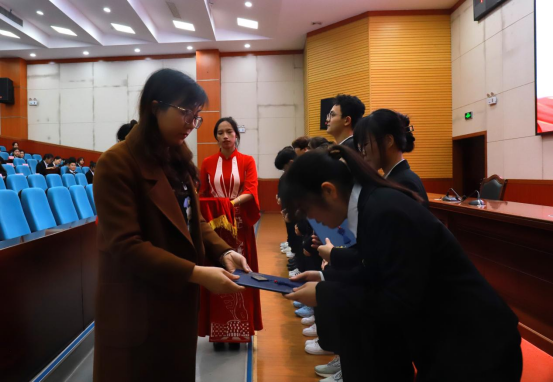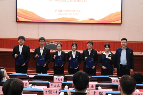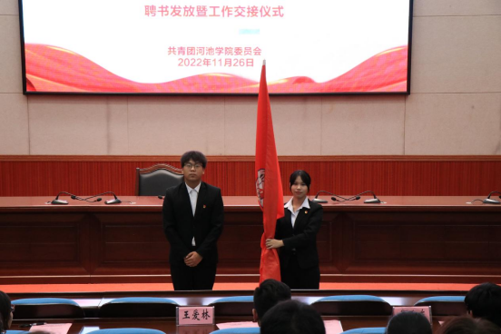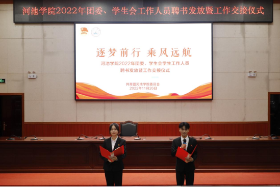 为有效开展校团委、学生会工作,培养和壮大团学队伍,保证团学工作的连续性,校团委、学生会于11月26日晚,在弘毅楼1-205报告厅举行聘书发放暨工作交接仪式。校团委副书记王爱林、校团委老师胡海东、徐辛酉以及校团委、学生会全体成员、社团团工委、大学生志愿者联合会和刘三姐大学生艺术团、团委新媒体中心、各二级学院学生代表参加本次仪式。