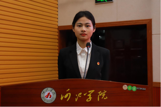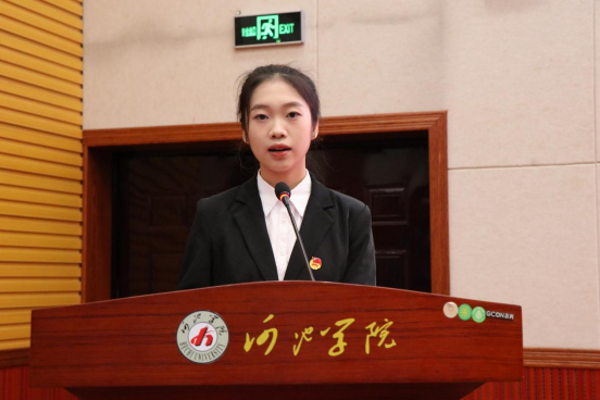 接下来,第二十届团学成员蓝宁代表发言,她从“学风建设、思想建设、自身建设”三个层面讲述新一年的团学工作要做好横向与纵向的信息传递,真正做到“全心全意为同学服务”,并希望新一届团学成员们能用“忠诚执著、求真务实”的河院精神来要求自己,为校团委、学生会的发展和建设奉献自己的青春力量。