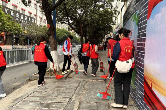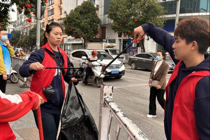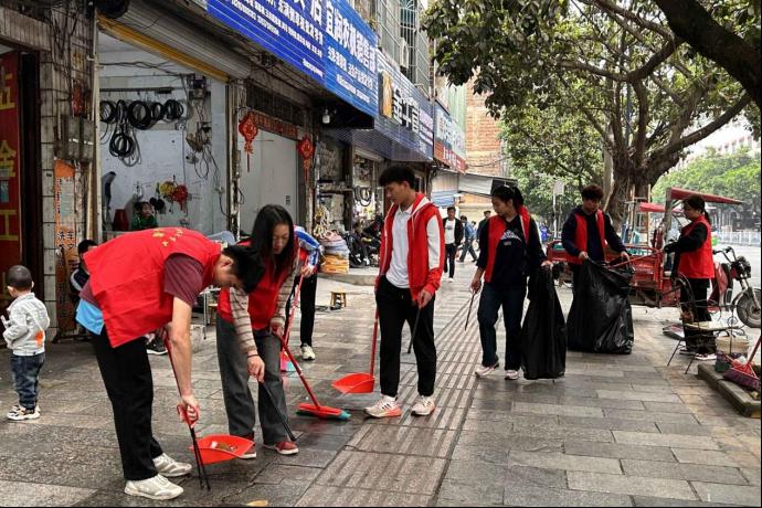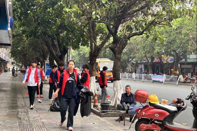 图为必赢3003no1线路检测中心学子打扫完街道垃圾后,检查周边是否有遗漏垃圾未清理