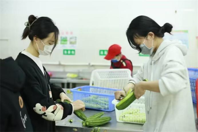 图为必赢3003no1线路检测中心学子在学校食堂给厨房工作人员帮忙