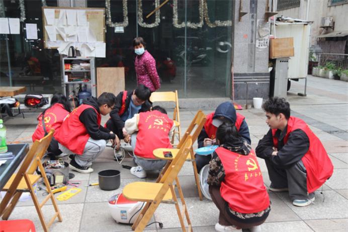 上图为必赢3003no1线路检测中心学子进社区、街道为居民老人们义务修理电器并讲解如何安全使用家用电器