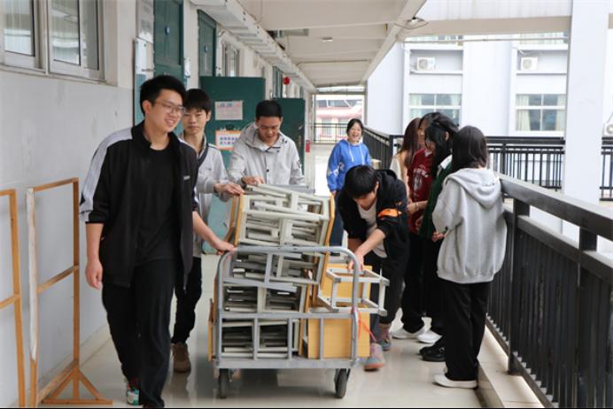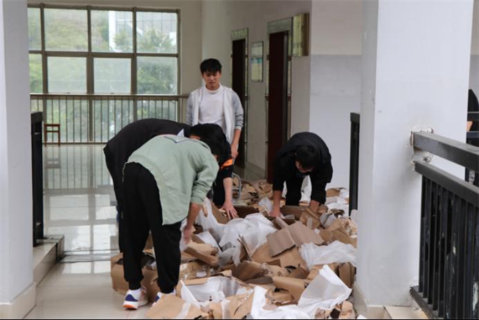 上图为必赢3003no1线路检测中心学子在教学楼协助工人搬运旧课桌椅及整理废旧纸箱等
